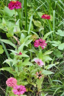 和名百日草は、夏から秋までその名の通り、ほぼ百日咲き続けることが命名の由来です。メキシコ原産で、蕾が固く長く咲くので重宝がられ夏の花壇で人気があります。草丈60~80㌢程で、葉をさわると表面に毛があり、形は長い卵形で柄がなく対生しています。花弁が厚く丈夫で育てやすく、花の色も、紅、赤、黄、クリーム、白等多彩です。直立した茎にキクに似た形の頭花には、一重咲き、八重咲き、丸弁のダリア咲き、小輪のポンポン咲きのものなど変化も多いです。キク科の一年草ですが、一度植えるとこぼれ種で自然に増えることがあります。